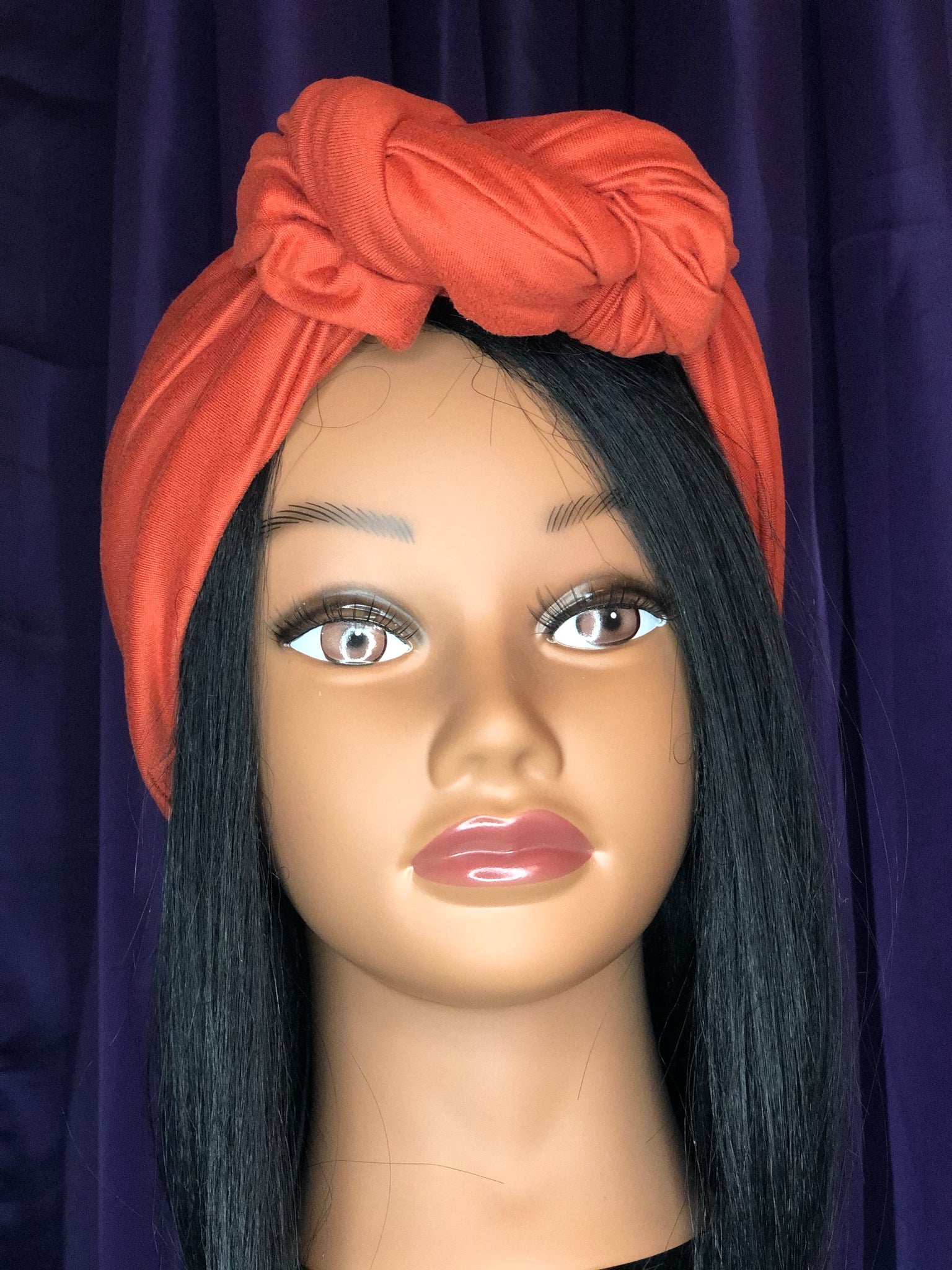 The rust orange Knotted Up Turban is available in all sizes, different colors, and can be made as a Mommy and Me set. This turban has an adjustable knot. The tighter you pull the knot, the better the fit and the bigger the knot.
